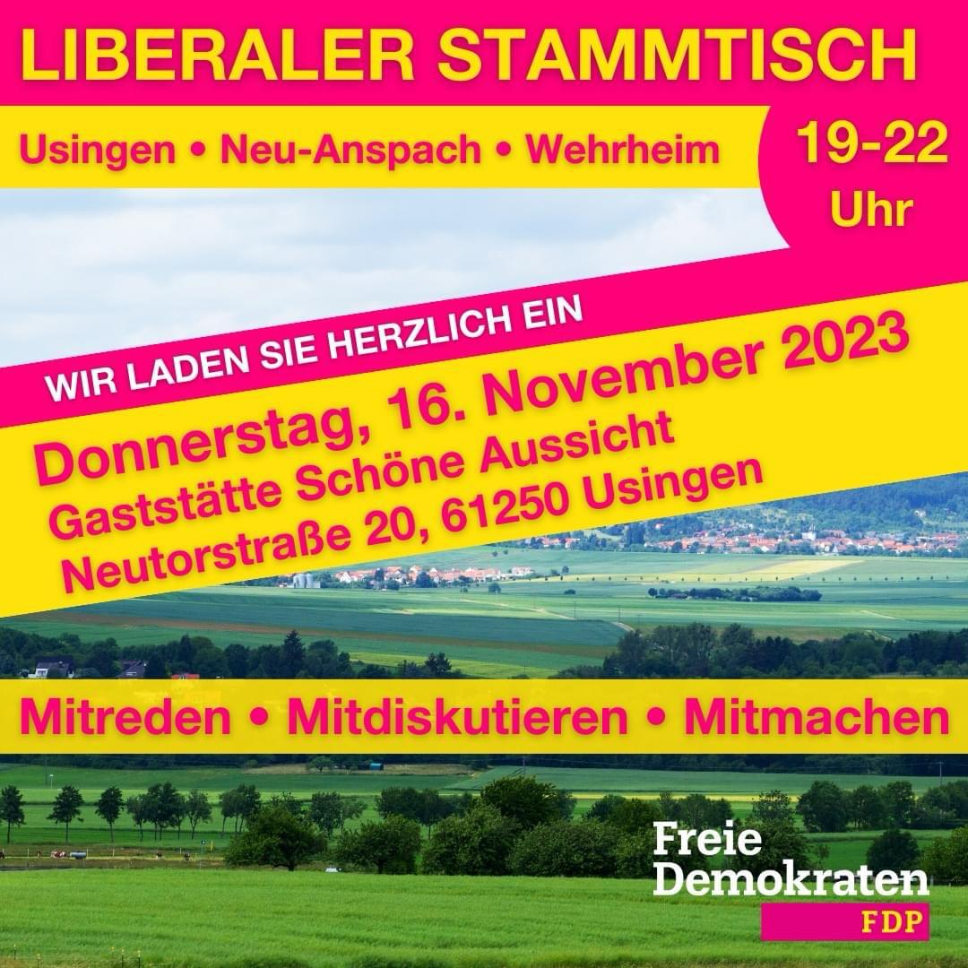 Unter dem Motto „Mitreden – Mitdiskutieren – Mitmachen“ laden die Freien Demokraten zur Teilnahme ein. Die Moderation des Abends hat der Usinger Bernd Büchner, als Vertreter des gastgebenden Ortsverbandes. „Beim Liberalen Stammtisch sollen möglichst viele unterschiedliche Themen angesprochen und diskutiert werden. Erkenntnisse daraus werden wir in die politische Arbeit unserer Ortsverbände einfließen lassen. Es ist wichtig, die Ansichten, Ideen und Anregungen der Menschen gut zu kennen. Der Stammtisch bietet eine wunderbare Gelegenheit, um sich in gemütlicher Runde auszutauschen“, sagt Büchner.